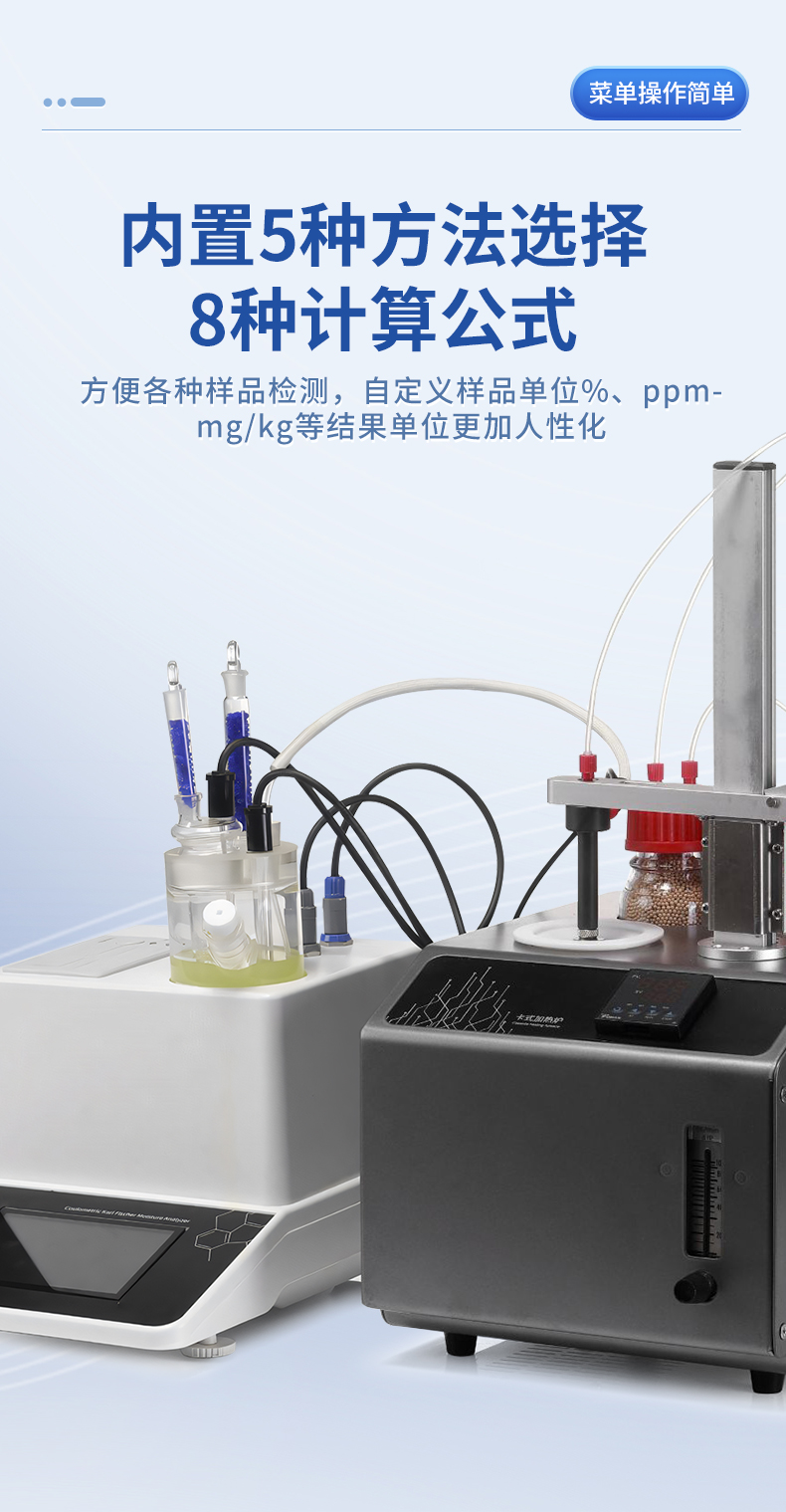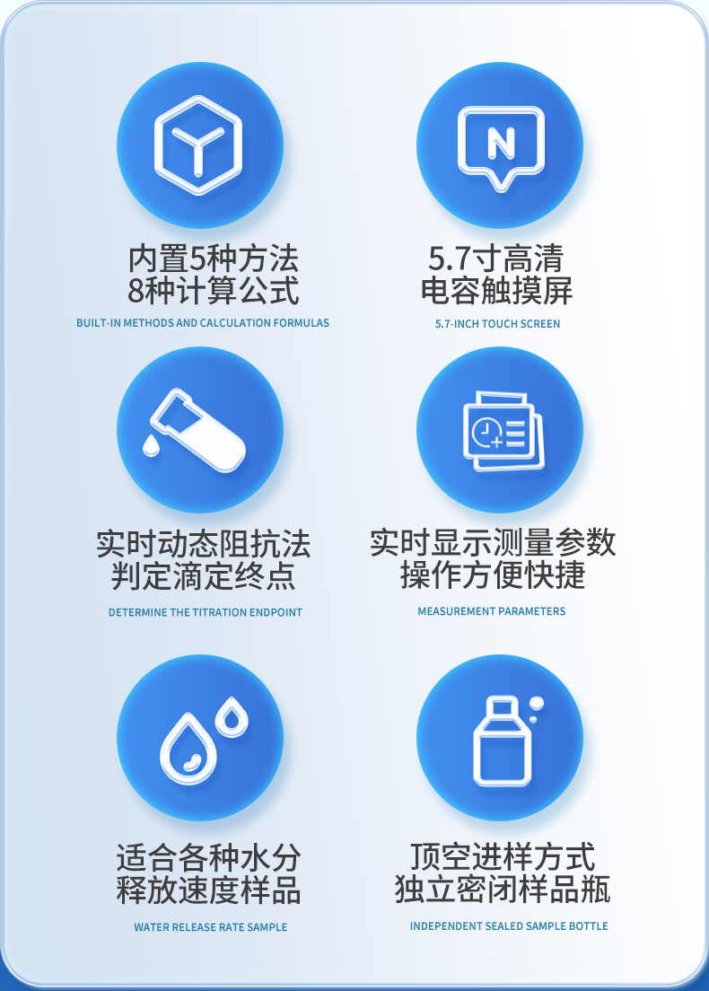 1. 采用高精度庫侖法水分測定儀與卡氏加熱爐聯用,**可以檢測到3μg水,精度達到ppm級;2. 空芯氣針進樣,和帶加熱功能的氣體輸送管路,零死體積水汽不凝結,操作更簡單,同時也很大的提高了儀器的準確性和重復性;3. 5.7寸高清電容觸摸屏,實時顯示測量參數,簡潔明了的功能菜單,全面的參數顯示,操作方便快捷 ;4. 內置5種方法可供選擇,8種計算公式方便各種樣品檢測,自定義樣品單位%、ppm、mg/kg等結果單位更加人性化;5. 系統實時檢測環境中的水分,精準扣除漂移,采用實時動態阻抗法判定滴定終點,測量結果更精準;6. **溫度300℃可以滿足大部分樣品檢測,氣流0-100ml可調,適合各種水分釋放速度的樣品;7. 操作方便,用戶只需要設置合適的溫度,合適的流量,把樣品放入事先準備好的樣品瓶,放入加熱器,然后把傳輸針扎入樣品瓶的硅膠墊,在儀器上點開始測量即可;8. 無需等待上一次樣品瓶冷卻之后才能進行下一次樣品測量,更換樣品瓶過程中樣品瓶始終保持密封狀態,測量效率更高更準確,尤其是吸濕性強的樣品無需擔心空氣中水分的干擾;9. 采用頂空進樣的方式,保證每個測定采用“新”的樣品瓶,樣品測定無交叉感染。樣品瓶體積小,確保較小的死體積和背景水分值。獨立密閉樣品瓶,測定時無需樣品轉移,結果更準確;10. 旋蓋式樣品瓶,無需專用且昂貴的壓蓋器和開蓋器,使用非常方便;11. 頂空進樣技術,只有氣體進入水分測定儀反應杯,不污染反應杯及電解電極。