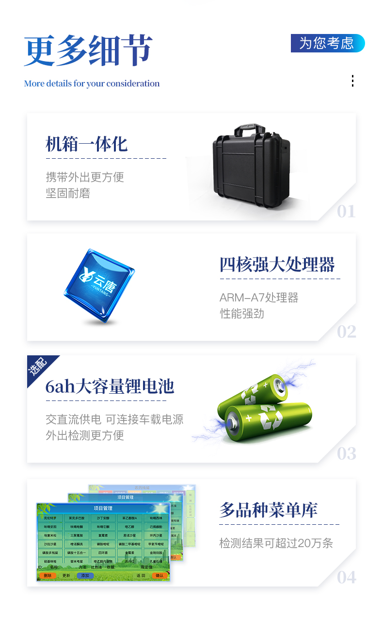 廣泛應用于主要用于蔬菜、水果、茶葉、糧食、農副產品等食品中有機磷和氨基甲酸酯類農藥殘留的快速檢測;此外還可用于果蔬茶生產基地和農貿批發銷售市場現場檢測,餐館、學校、食堂、家庭果蔬加工前的安全速測等。