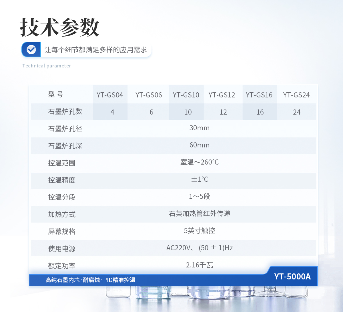 | 石墨爐孔:孔徑30mm,孔深60mm,孔數5×2 | 控溫范圍:室溫~260℃ | 控溫精度:±1℃ | 控溫分段:1~5段 | 加熱方式:石英加熱管紅外傳遞 | 屏幕規格:5寸觸控 | 主機外型尺寸:寬522mm×深371mm×高168mm | 使用電源:AC220V、 (50 ± 1)Hz | 額定功率:1.6千瓦 |